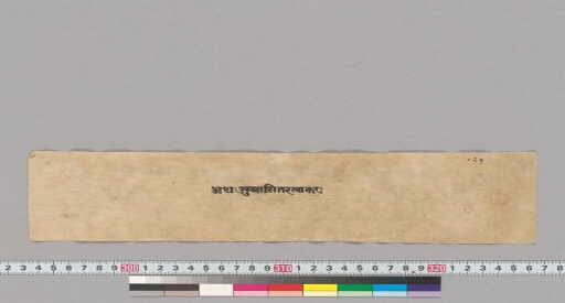 This text describes Śākyamuni telling his disciples about the power of the mantra Suvarṇa-prabhāsa, which even householders and women of family background who seek knowledge of the Buddhas and wish to worship Śākyamuni should hear and preach. The manuscript contains 20 chapters, each referred to as a parivartta. The text was translated into Chinese by Dharmamatatsin of the Northern Liang dynasty (502–565 CE) (Mitra, 1882, p. 241). This text is similar to Sl. no. 481; however, folios 26, 42, 91, and 95 are missing from this manuscript.