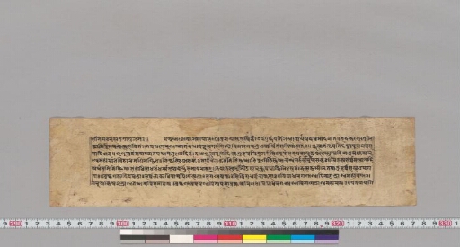 This is a composite mss. containing two works. The Vasudhārānāmāṣṭottaraśata is from fols 1b1 to 4b1 and is dedicated to Vasudhārā is the goddess of the bodhisattva of wealth, prosperity, and abundance (who has a strong following among the Newar Buddhists of the Kathmandu valley) (Buddhist Digital Archives). This text supposedly consists of 108 epithets forming a hymn in praise of Vasundhari, apparently meant for the presiding divinity of the earth or Prithvi Devī, but her abode is said to be in the Tuṣitā heaven." (Mitra, 274). The second item is the and Vajravidāraṇahṛdayamantradhāraṇī from fol. 4b2–7b4. "Vajravidarana is a semi-wrathful form of Vajrapani and the deity’s dharani, categorised as a Kriya Tantra, is known for its healing and purifying effect. The dharani has inspired a large number of ritual liturgies and commentaries, both Indic and Tibetan, and is commonly recited by Tibetan and Newar Buddhists." (Rigpa Shedra)